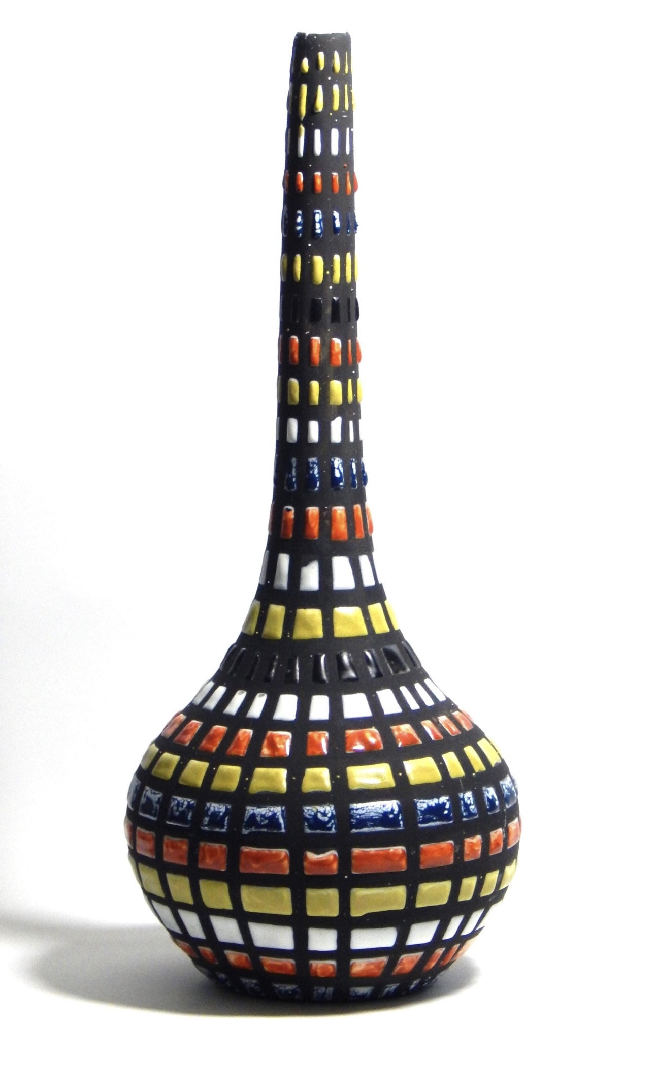 Capron utilise un subtil mélange d’émaux mats et brillants, avec souvent des contrastes forts entre zones émaillées et réserves non émaillées. Les contours noirs ou bruns soulignent les formes et apportent un relief caractéristique.