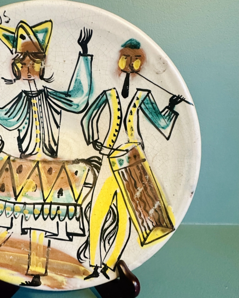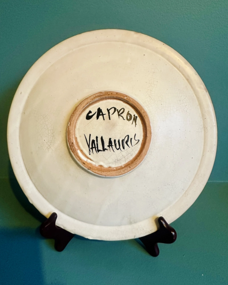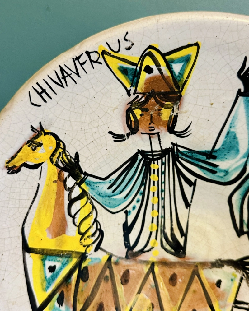 Superbe assiette en céramique émaillée signée Roger Capron, réalisée à Vallauris dans les années 1950 et illustrant une scène festive des “Chivau Frus”, ces chevaux costumés et personnages folkloriques des traditions provençales.