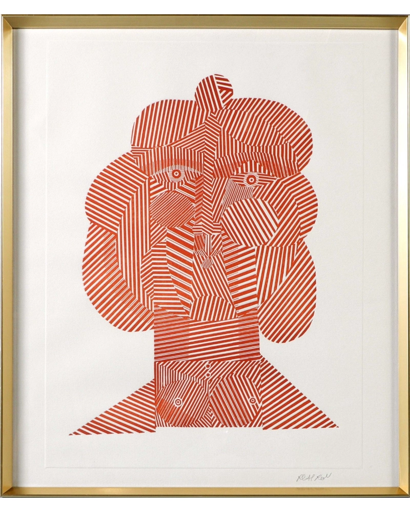 Œuvre graphique d’une grande élégance, La Dame Rouge témoigne de la maîtrise de Capron dans l’art du trait. Le visage féminin est entièrement construit par un jeu de lignes parallèles d’un rouge vif, créant un effet cinétique et sculptural remarquable.