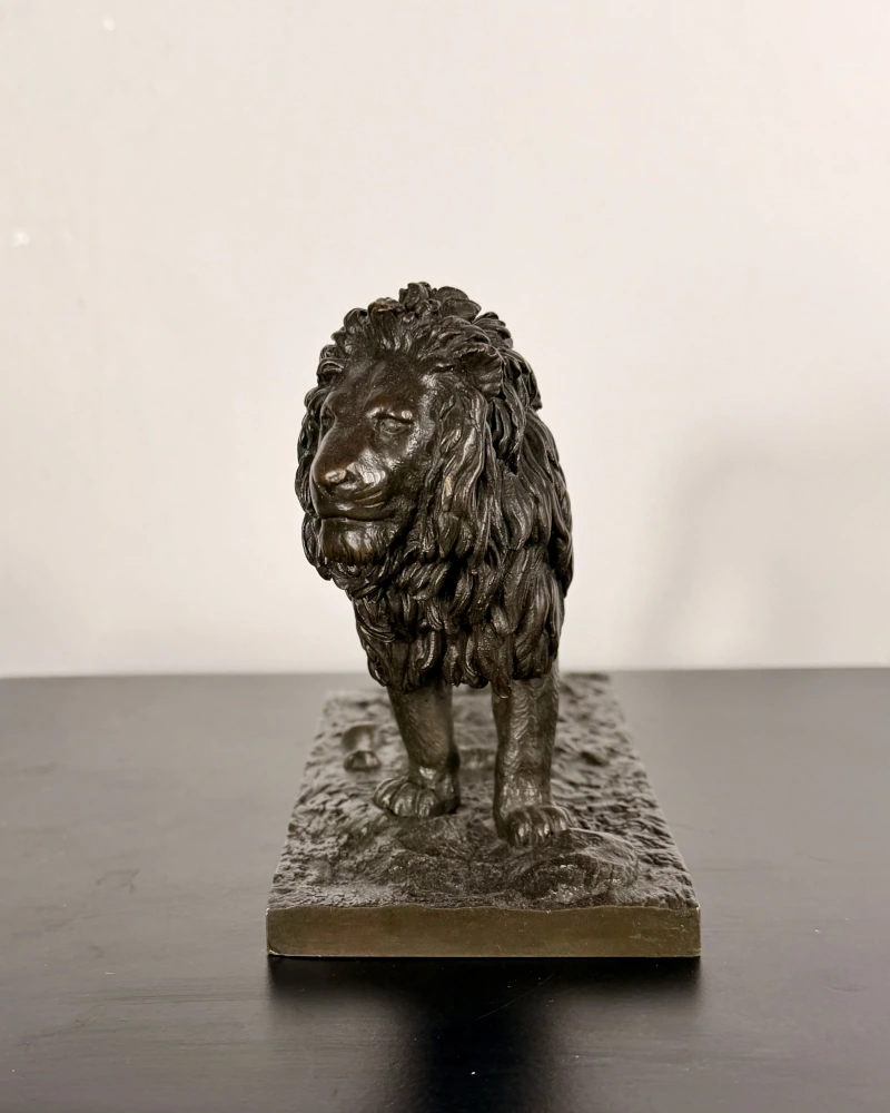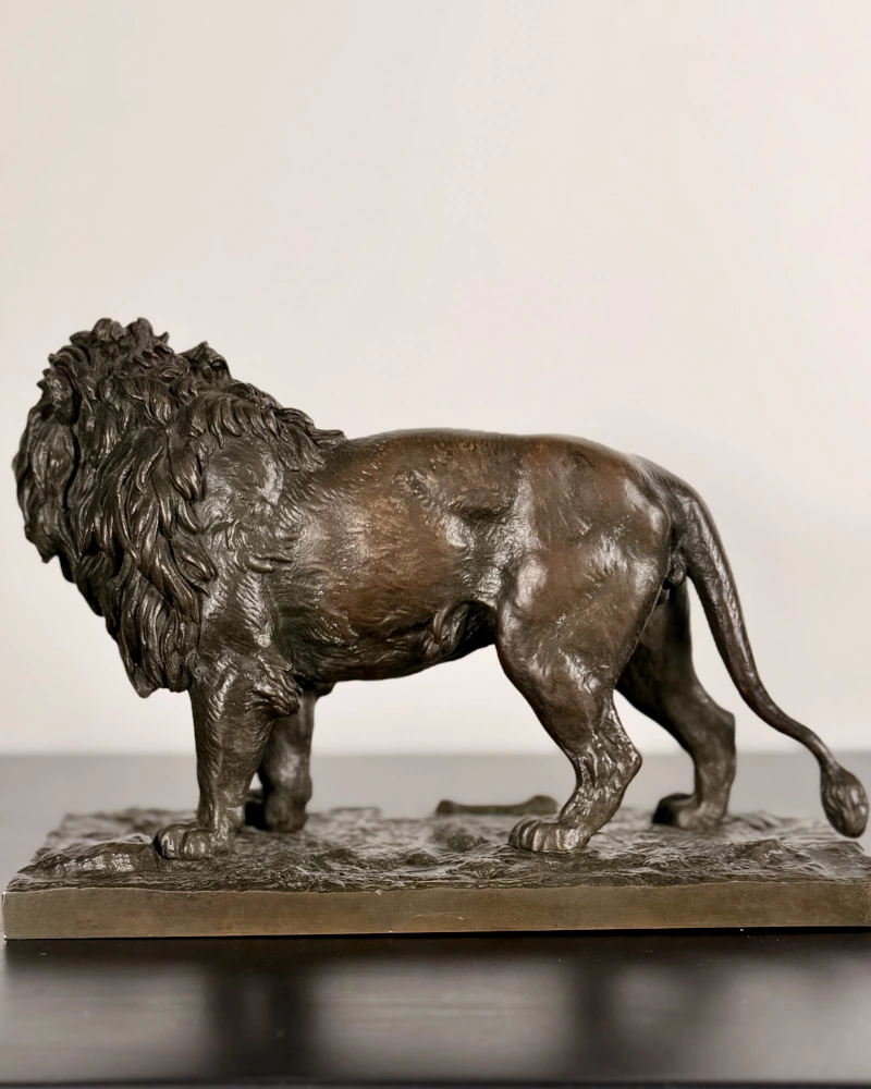 Élégante sculpture en bronze représentant un lion majestueux en position d’observation, d’après le célèbre sculpteur animalier Antoine-Louis Barye, maître incontesté de la sculpture animalière du XIXe siècle.