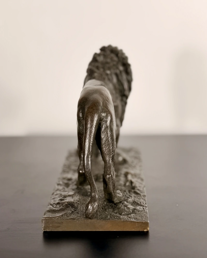 Cette pièce séduit par la puissance de sa composition, la qualité du modelé et la finesse des détails : musculature tendue, crinière abondante et expression noble du regard traduisent toute la maîtrise inspirée de l’œuvre de Barye. La patine brun nuancé met en valeur les reliefs et apporte à l’ensemble une belle profondeur visuelle.