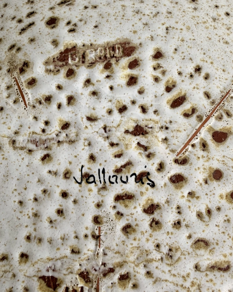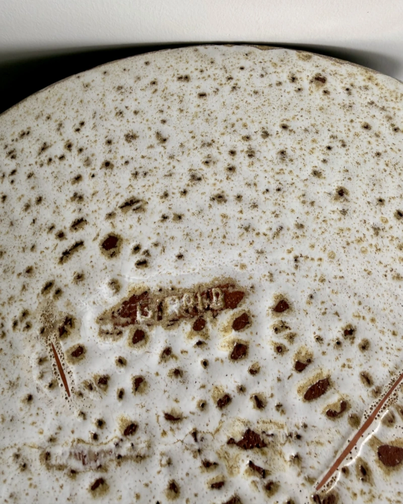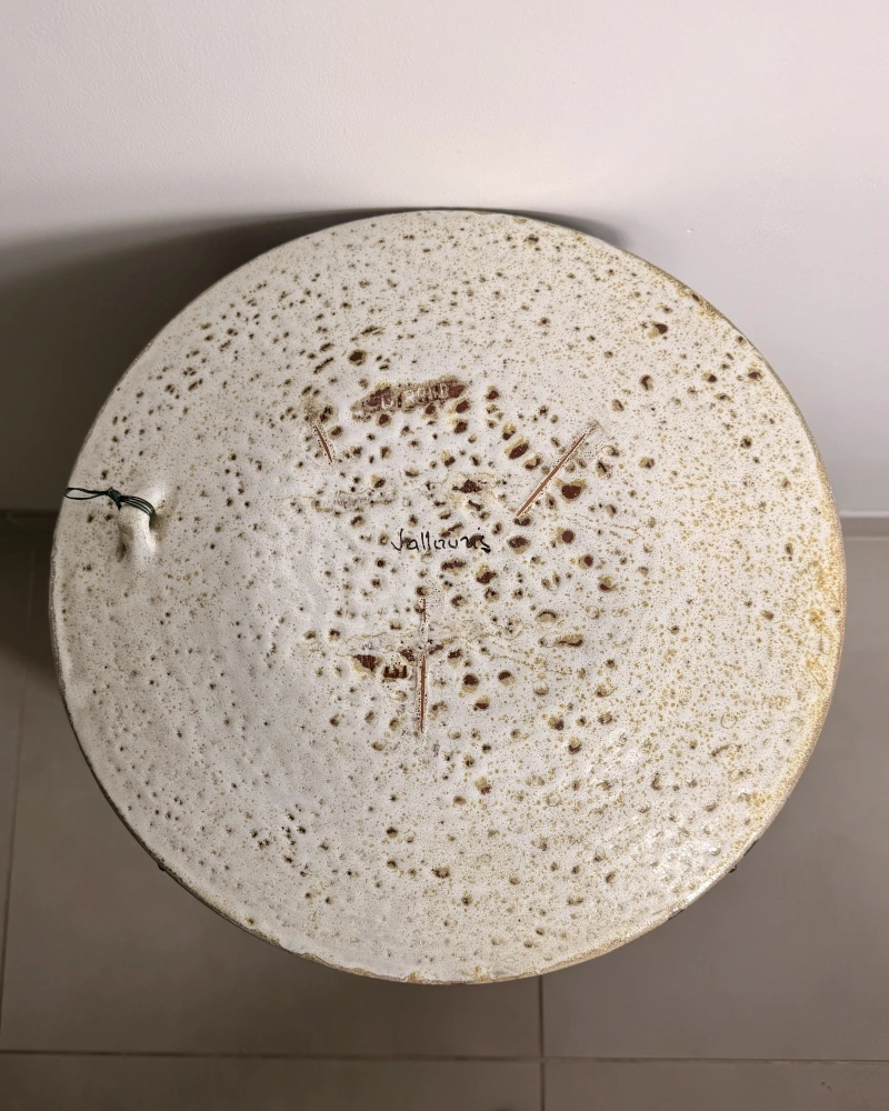 Le travail de la matière et l’élégance de l’émail mat confèrent à l’ensemble une présence sculpturale très caractéristique de l’esthétique de Vallauris des années 50/60. À la fois décoratif et intemporel, ce plat peut être présenté en centre de table, sur un buffet ou en décoration murale.