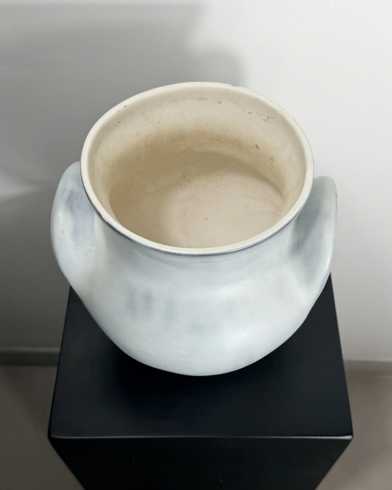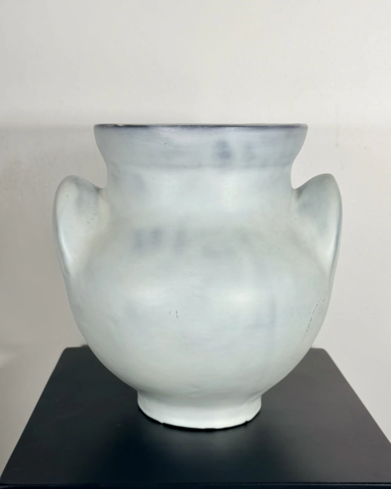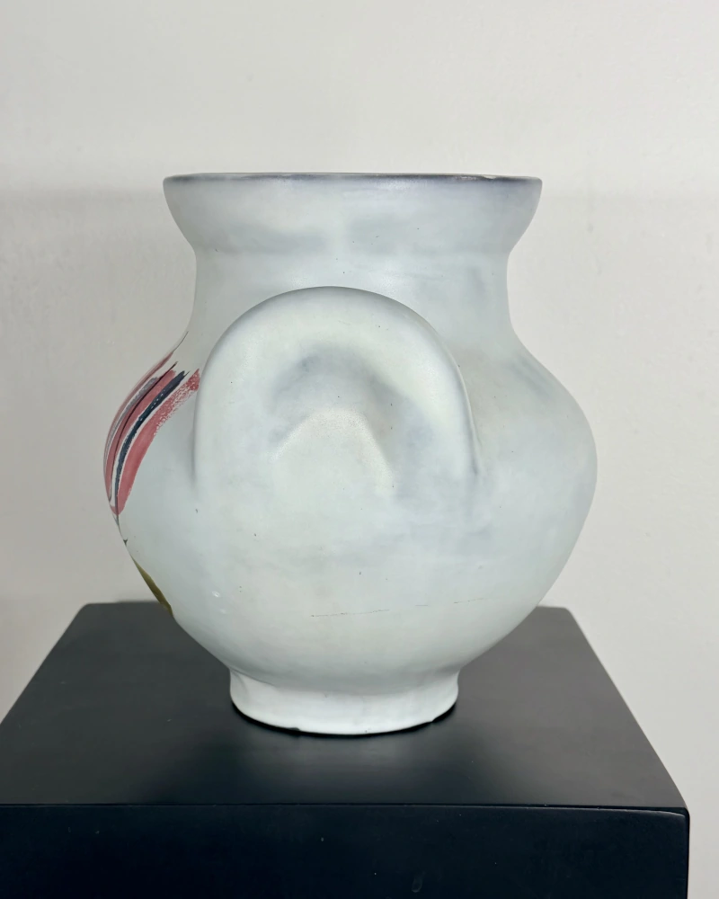 Ce modèle se distingue par sa forme généreuse aux épaules arrondies, sublimée par deux anses latérales dites « à oreilles », emblématiques de la production de Vallauris durant la période de la reconstruction.